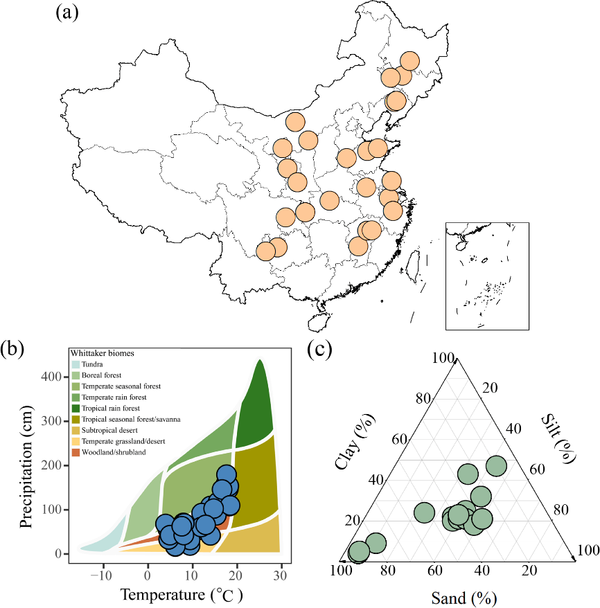 图1 生物炭添加实验点在地理、气候和质地上的分布
