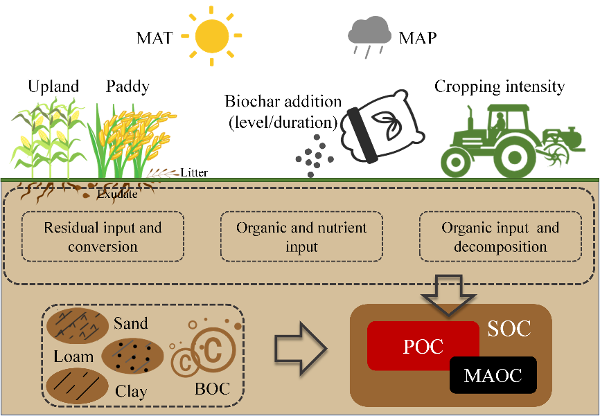 近日,草业学院草地生态系统管理团队在生物炭添加对土壤有机碳固存效率的影响机制方面取得新进展,相关研究成果以“Soil organic carbon sequestration efficiency with biochar addition across the croplands of China: A perspective from particulate and mineral-associated organic carbon”发表在Environmental Research(SCI-2区,IF 7.7)期刊上,该论文以2024级硕士研究生刘子怡为第一作者,山西农业大学草业学院徐沛东副教授为通讯作者。山西农业大学草业学院董宽虎教授和赵祥教授,山西农业大学资源环境学院徐明岗院士和刘奋武教授对本研究做了深入积极的指导。该研究得到国家自然科学基金区域创新发展联合基金重点项目(U22A20576)和土壤健康山西省实验室自主研究课题(SHL2025IP07)等的支持。