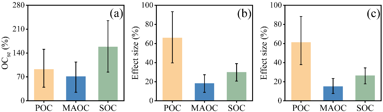 土壤有机碳(SOC)是陆地最大的碳库,可划分为颗粒有机碳(POC)和矿物结合有机碳(MAOC)。生物炭已被广泛用于土壤固碳,但在全国尺度上对POC、MAOC和SOC固碳效率的影响及驱动机制仍不清楚。团队人员提取了926对田间试验数据,覆盖了我国主要农田生态系统。通过线性混合效应模型评估了生物炭添加对POC、MAOC和SOC固碳效率的影响。利用随机森林机器学习算法结合高分辨率环境数据,预测并绘制了全国表层土壤POC、MAOC和SOC固碳效率的空间分布图。