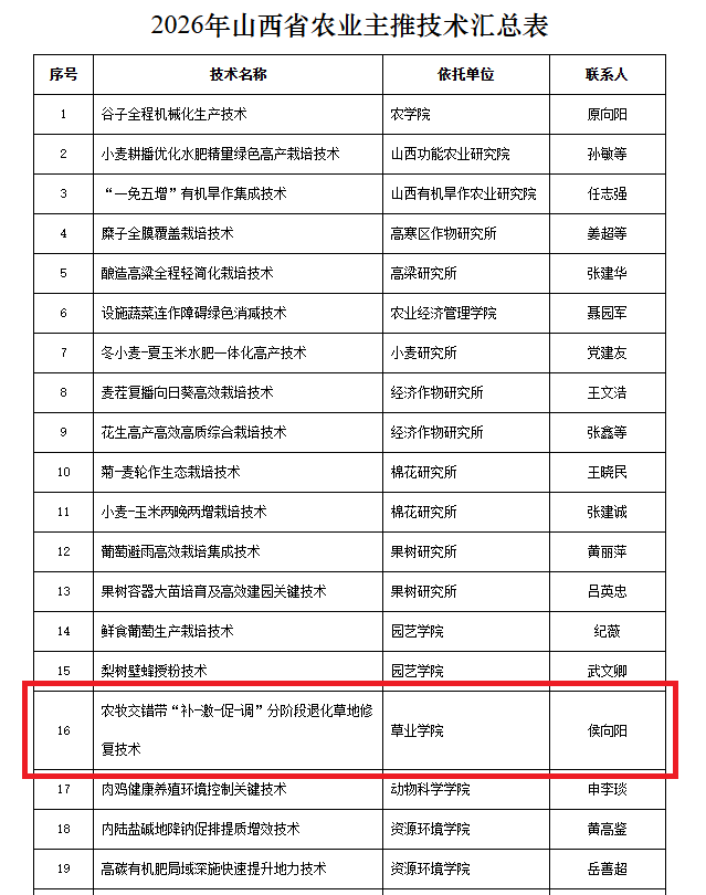 近日,山西省农业农村厅发布了关于2026年农业主导品种主推技术的通知,我院侯向阳教授第一技术负责人完成《农牧交错带“补-激-促-调”分阶段退化草地修复技术》入选农业主推技术。