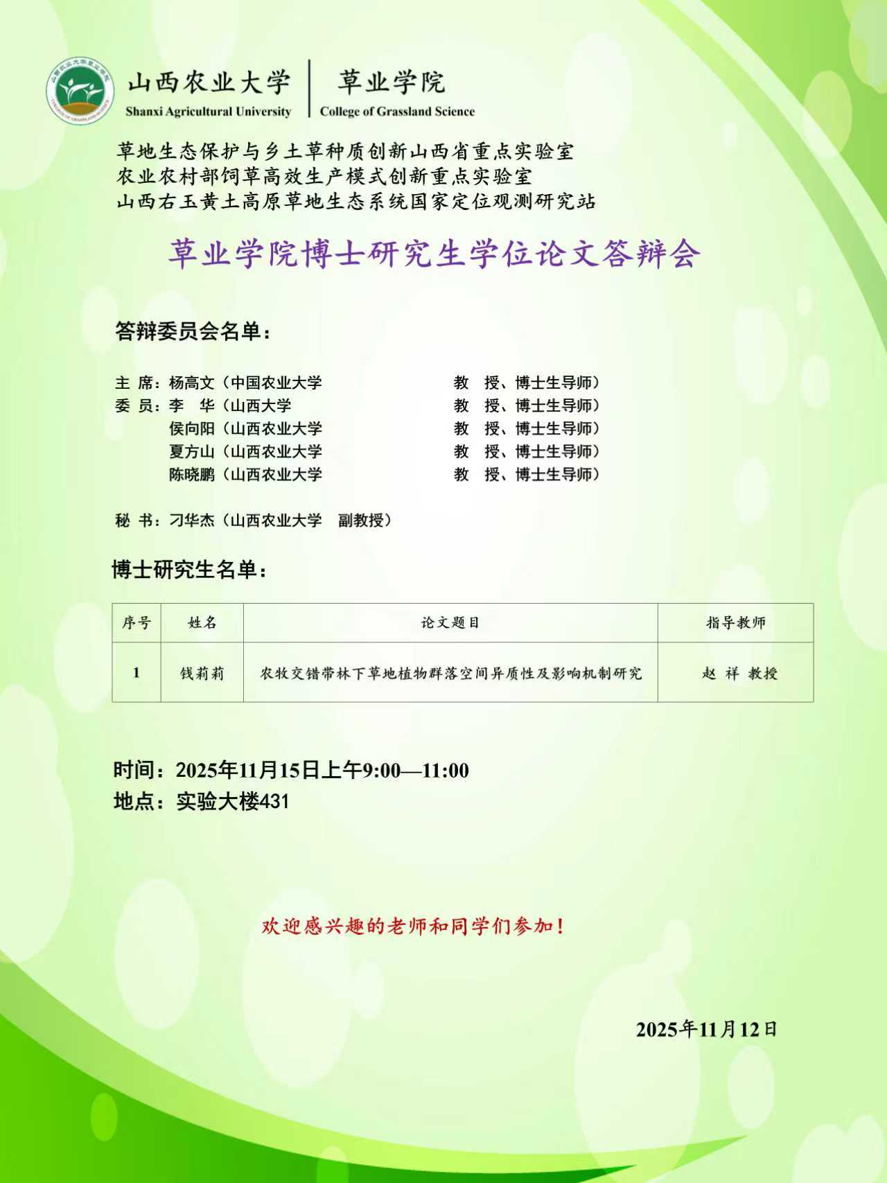 草业学院研究生毕业(学位)论文答辩公告(一)